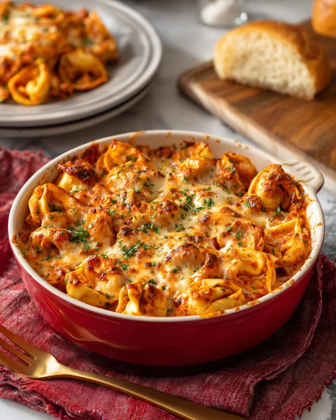 A2: Fresh or frozen tortellini are highly recommended for this recipe as they cook beautifully in the oven without becoming mushy. Dry tortellini can also be used, but it’s best to boil it al dente before assembling to ensure it cooks evenly in the bake.